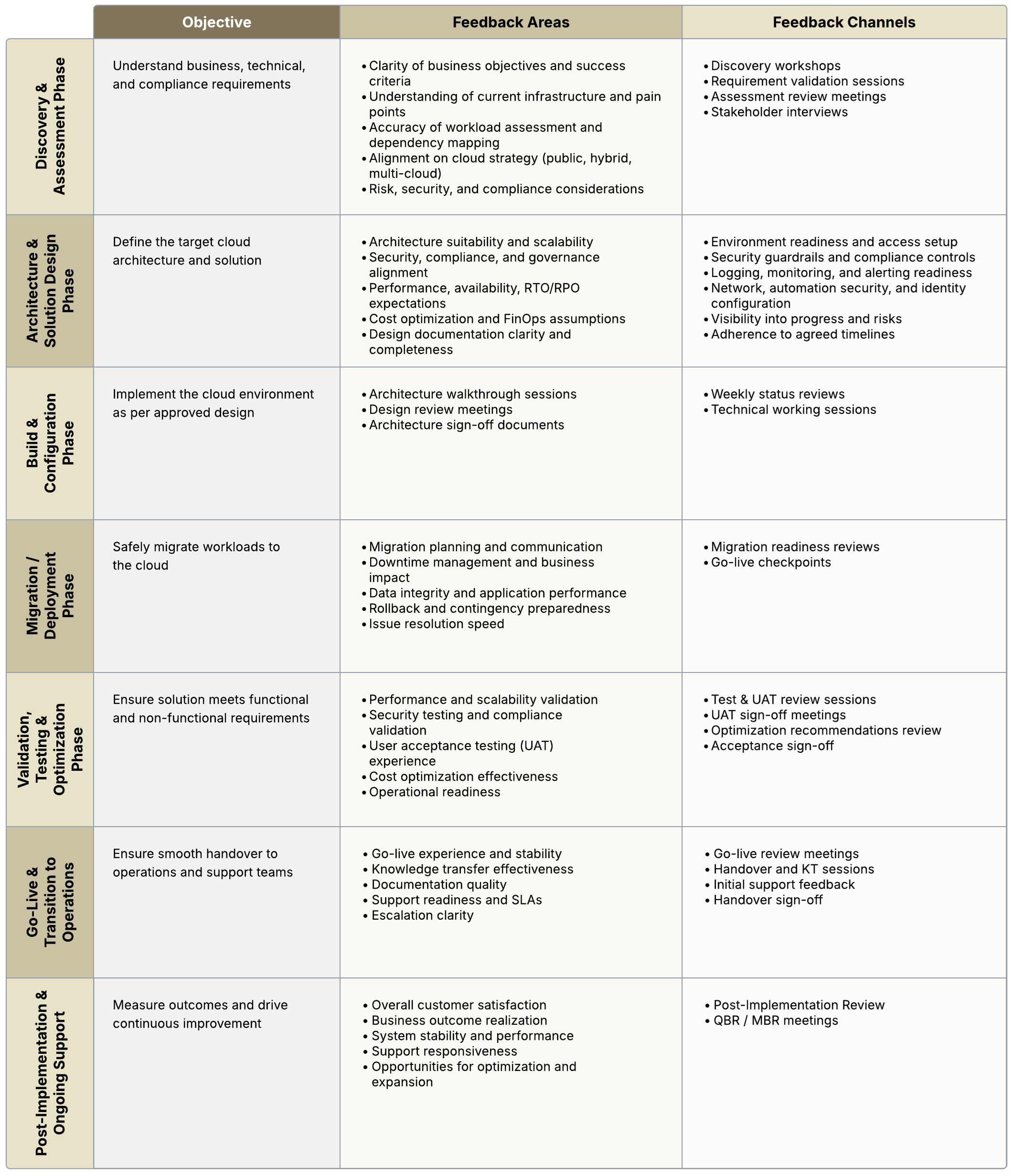 Our delivery approach is built around a structured, feedback-driven methodology that ensures alignment with business goals, technical excellence, and long-term operational success. Each phase of the engagement incorporates defined feedback areas and formal review mechanisms to maintain transparency, quality, and predictability.